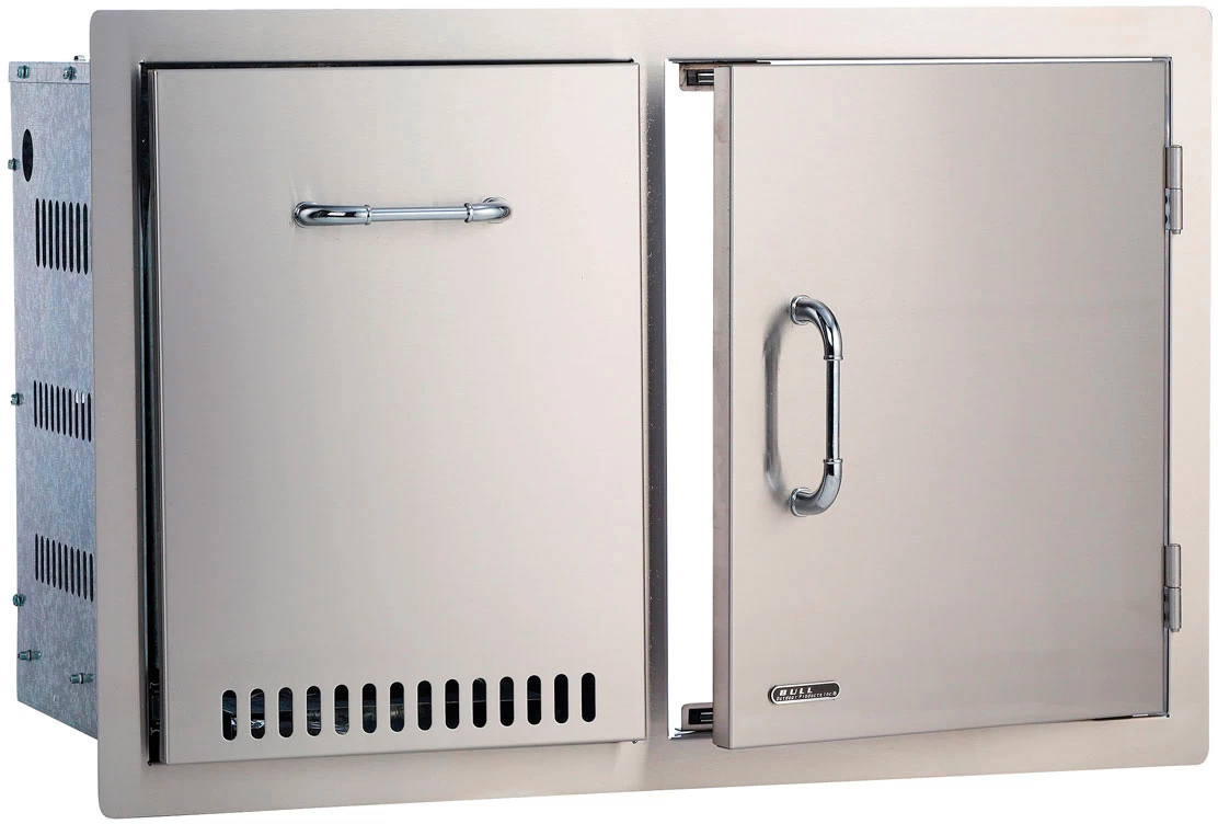 Das Schubladen-Kombi-Modul von Bull bietet einen großen, belüfteten Schubladen-Auszug und eine rechts angeschlagene Tür in einem gemeinsamen Einbaurahmen. So haben Sie viel Platz zum Unterbringen von Grillzubehör.