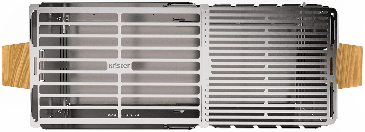 Der Knister Grill kann im zusammengeschobenen Zustand mit einem Grillrost betrieben werden, oder auf voller Breite mit beiden Grillrosten. Für maximale Flexibilität lässt sich der kleinere Grillrost auch seitlich näher über der Kohle einschieben. Ideal zum scharf anbraten von Steaks.