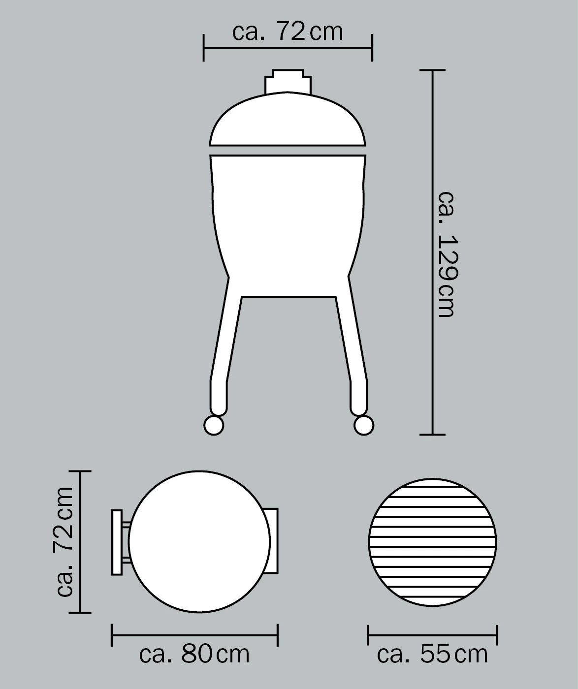 | Maße Grill incl. Gestell und Seitenablagen (B x H x T): | ca. 135 x 129 x 80 cm |